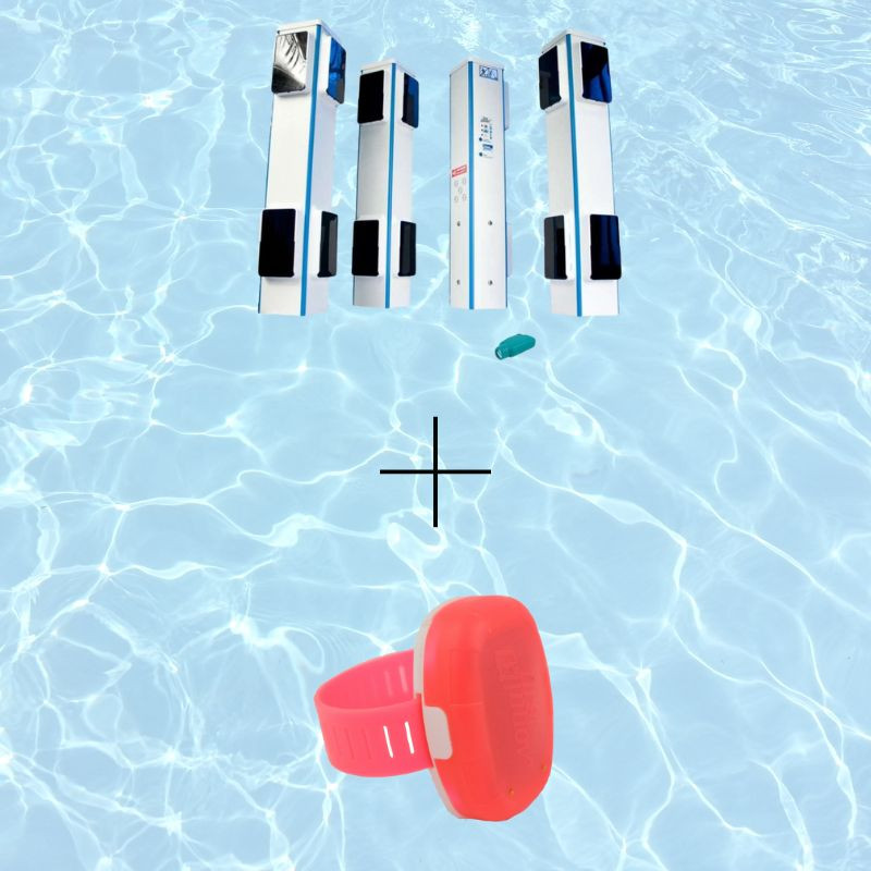 Protégez votre piscine avec le kit prima protect 4 bornes, accompagné du bracelet blueprotect pour enfant bleu ou rose.