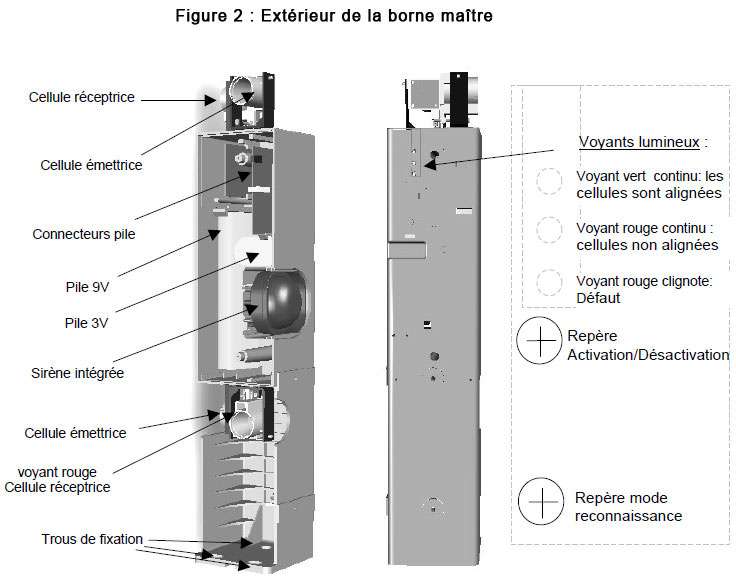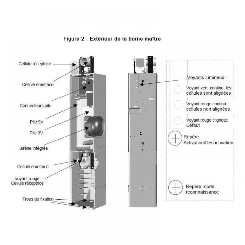 - Alimentation de la borne "Maître" : Par 1 Pack de piles 9 V