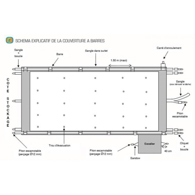 Elle comporte des trous d'évacuation des eaux de pluie, ce qui empêche l'eau de stagner au milieu de la bâche lorsque celle-ci est mise en place sur la piscine.